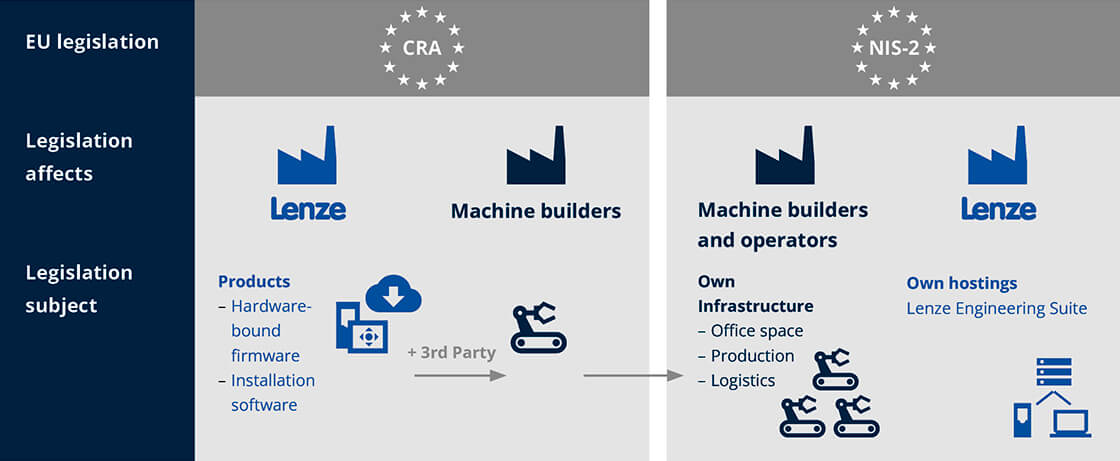 A partir de Dezembro de 2027, os fabricantes e fornecedores de máquinas só poderão vender componentes e máquinas com elementos digitais que atendam aos requisitos de segurança cibernética da CRA. A Lenze também está comprometida com esses requisitos.