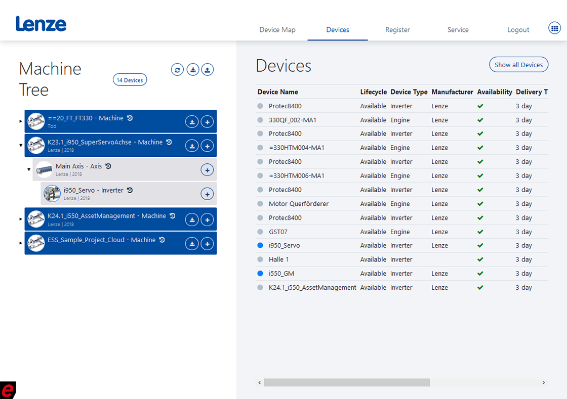 - Data backup for all the Lenze drive systems installed, to make sure they are up and running again as quickly as possible after downtime