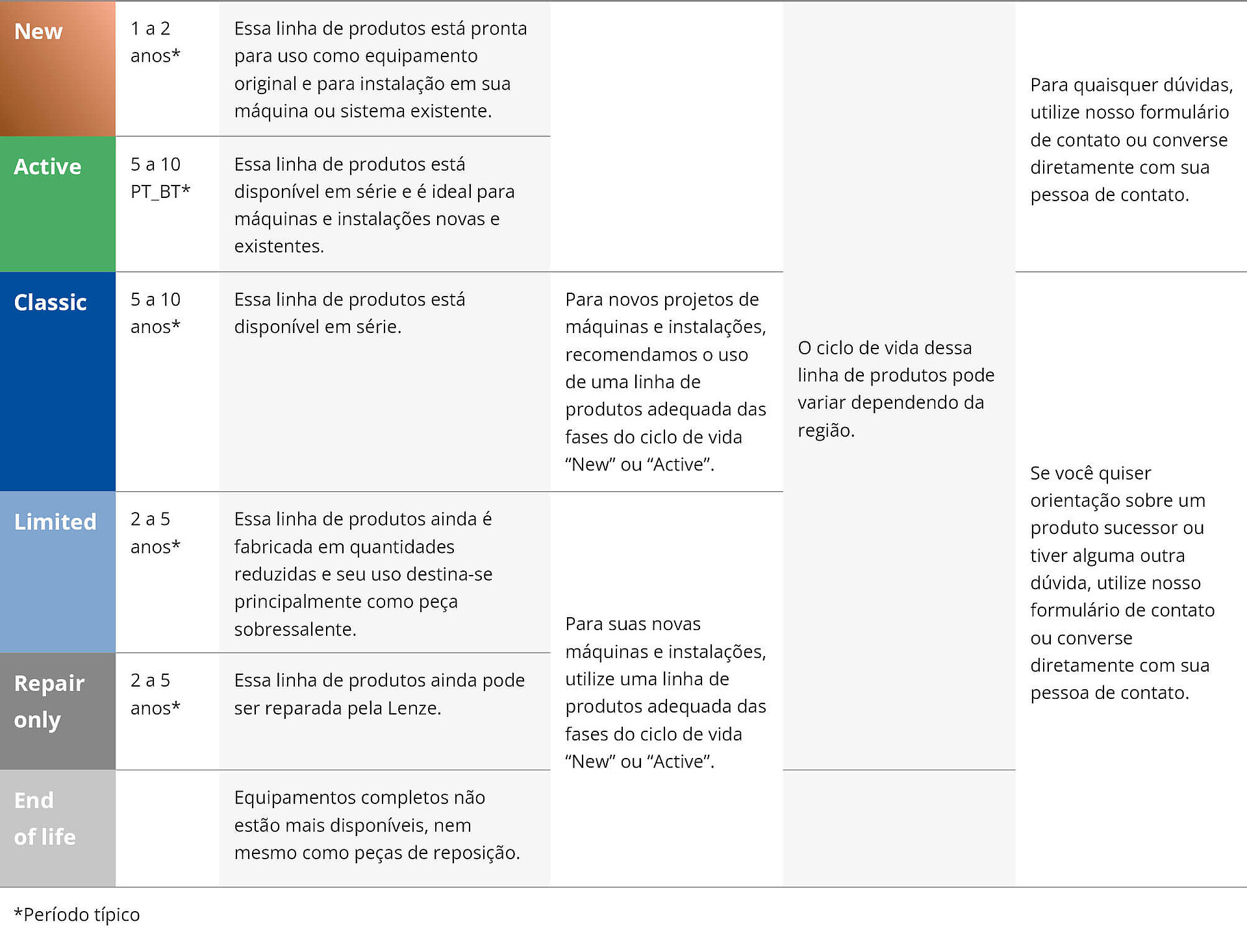 Estes serviços estão disponíveis para a linha de produtos na respectiva fase do ciclo de vida